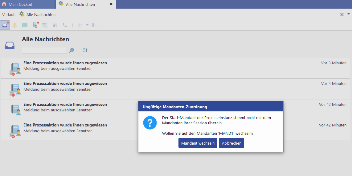 Eine ungültige Mandanten-Zuordnung wird im Benachrichtigungsmenü über das entsprechende Icon angezeigt. Kann der Anwender vor dem Öffnen den Mandaten auf den Start-Mandanten des Prozesses wechseln, so wird dies in einem Dialog angeboten.
