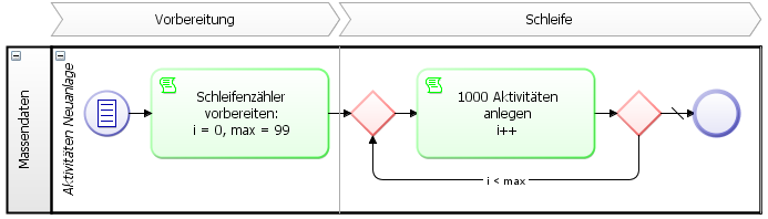Damit die Neuanlage für jedes Paket mit derselben Performanz läuft, muss die Transaktion unterbrochen werden. Generell gilt, dass Massendaten-Prozesse immer auf einer asynchronen Prozessausführung basieren sollten, da der Aufrufer des Prozesses nicht auf das Ende aktiv warten will. Die korrekte Lösung unterbricht die Schleife durch das Transaktionsunterbrechende Zwischenereignis: