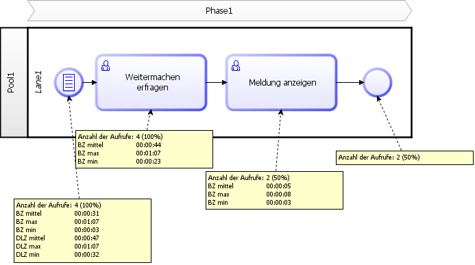 Wie Auswertung vorher, allerdings für den von Ihnen ausgewählten Prozess.Zeitenübersicht - Einzelner Prozess (nach Instanzen)