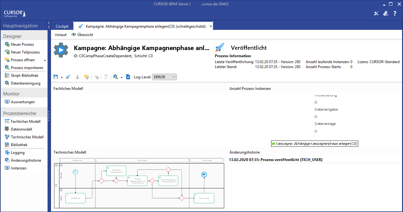 Prozesse aus der CURSOR-Standard-Schicht Partner-Schicht können übersteuert werden. Wird ein Prozess aus einer tieferen Schicht geöffnet, so ist dort die Bearbeitung deaktiviert. Der Kunde kann den Prozess übersteuern und dadurch eine Kopie des Prozesses mit derselben ID erzeugen. Im Kundensystem wird der Prozess in der neuen Customizing-Schicht ausgeführt, wenn dieser veröffentlicht wurde.