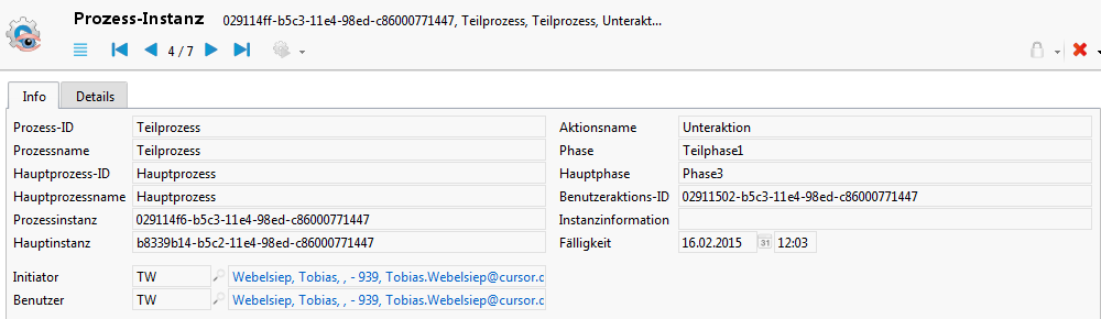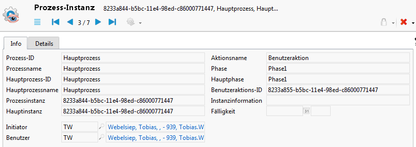 Der Name, die Instanz-ID und die Phase des Hauptprozesses werden im Datensatz mit ausgeben. Durch das angeheftete Zeitereignis wird die Fälligkeit der Benutzeraktion übernommen.