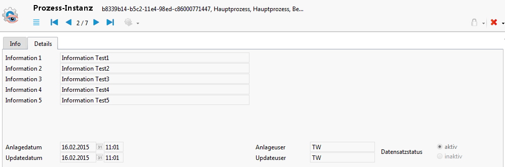 Diese Informationen werden auch zur Laufzeit in der Entität angeboten. In Teilprozessen müssen diese Informationen neu gesetzt und aus dem Hauptprozess übergeben werden.