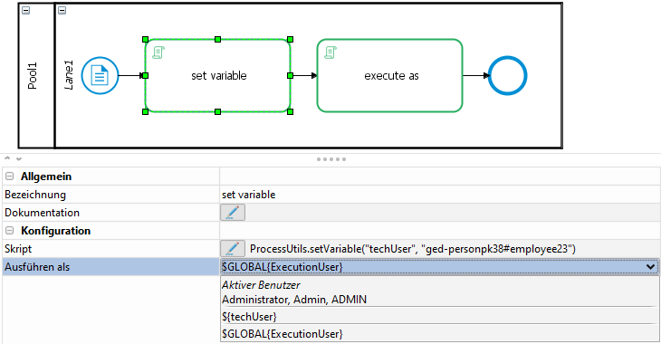 Sollte in einem Prozess eine Skript-Aktion mit davon abweichenden Rechten ausgeführt werden müssen, dann können Sie eine explizite Rechtezuweisung vornehmen. Anwendungsbeispiel: der letzte ausführende Mitarbeiter hat keine Rechte für die Neuanlage von Datensätzen und genau das soll die Skript-Aktion ausführen. Dazu wählen Sie im Feld Ausführen als in der Konfiguration der Skript-Aktionen einen technischen Benutzer aus. Dazu müssen Sie vorher Mitarbeiterdatensätze mit den gewünschten Rechten anlegen und diese als technischen Benutzer (Entitätsfeld: TechnicalUser.Employee) kennzeichnen.