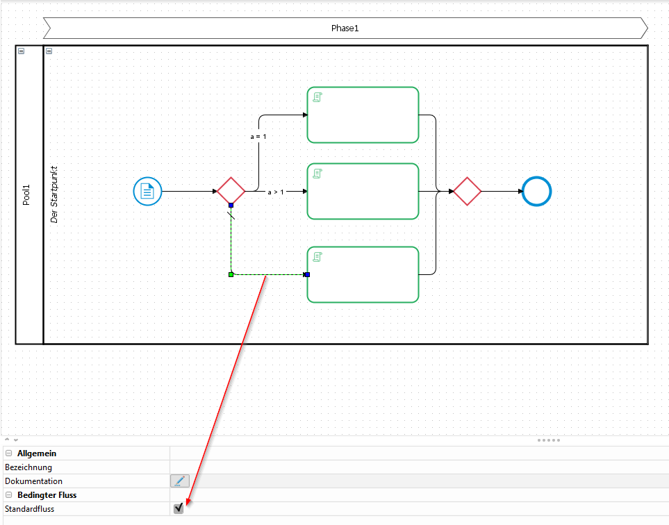 Der Standardfluss ist eine Option in den Eigenschaften der Kante. Nur eine Kante kann diese Option tragen.
