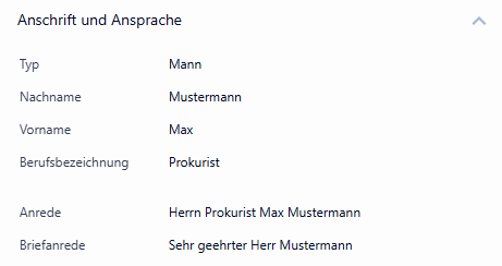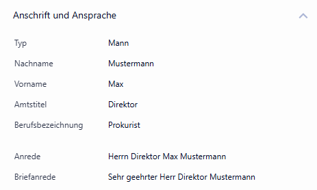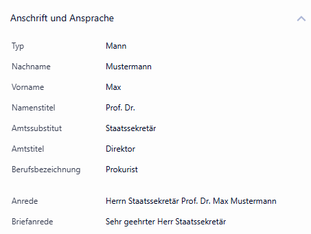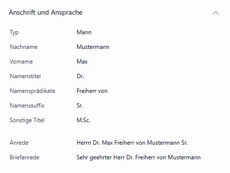Namenstitel, Namensprädikat und Namenssuffix werden in der Standard-Anrede angezeigt, während die sonstigen Titel nicht aufgenommen werden. Im nachfolgenden Beispiel ist das Zusammenspiel zwischen Namensfeldern und Anredegenerierung ersichtlich:
