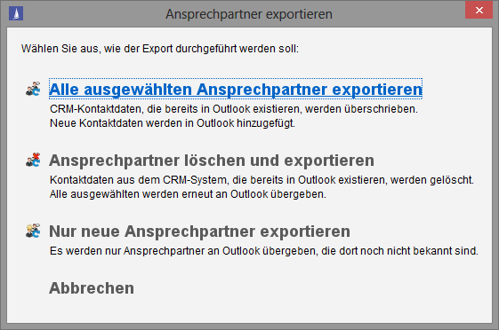 Jeder Ansprechpartner, der bereits exportiert wurde erhält in Outlook eine ID. Durch diese ID wird der Kontakt als "exportierter Ansprechpartner" in dem Zuordnungsdialog erkannt.Wählen Sie eine Export-Option aus . Die Kontakte werden exportiert.
