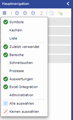 Über die Checkbox im Hauptnavigationskopf können Sie die Anzeige in der Hauptnaigation steuern. Die Einträge des myCRM-Bereiches können als Symbole, Kacheln oder Liste dargestellt werden. Elemente: Bereiche, Schnellsuchen, Prozesse und Auswertungen können ein- oder ausgeblendet werden.