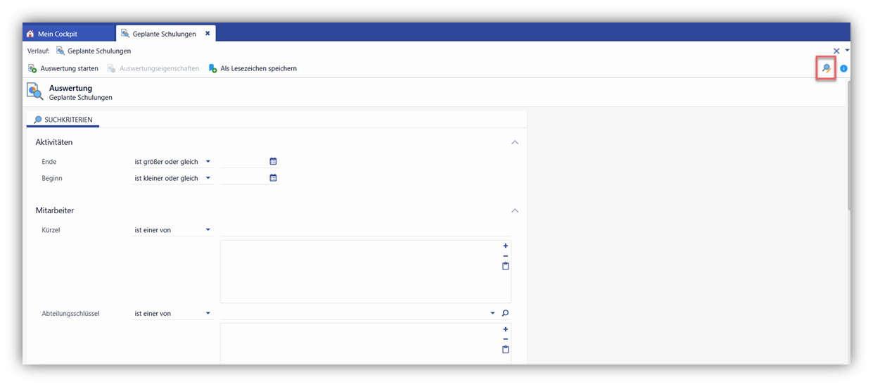 Es gibt die Möglichkeit, eine Suche zu einer Auswertung zu hinterlegen, sodass Suchkriterien vor der Ausführung der Auswertung eingegeben werden können - analog zu der Eingabe in der Erweiterten Suche.