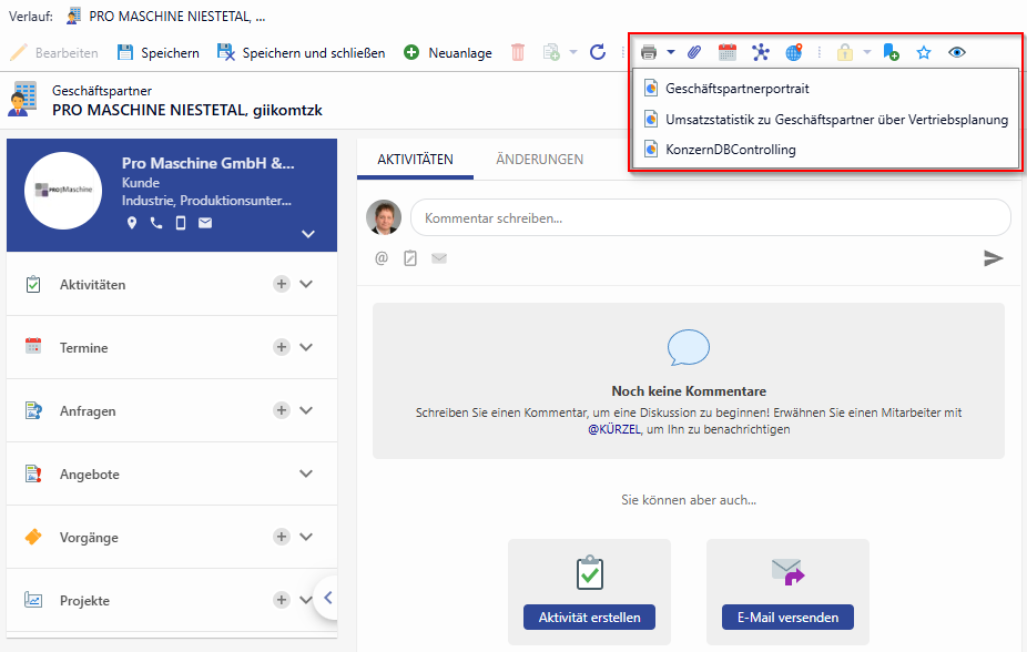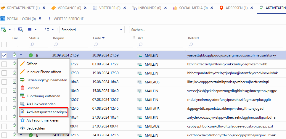 den Standard-Maskenreport für Aktivitäten starten. Das Ergebnis öffnet sich in einer separaten Lasche und entspricht der Ansicht eines Reports, der aus dem Auswertungsmenü gestartet wurde.