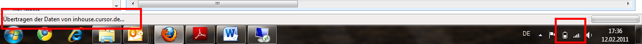 Reagiert die Anwendung nicht (z.B. Laschen lassen sich nicht schließen, Suchen lassen sich nicht ausführen) und bleibt der Hinweis in der Statusleiste des Firefox-Browsers ('Übertragen der Daten von ...') stehen, deutet das auf den Abbruch der Netzwerkverbindung hin.
