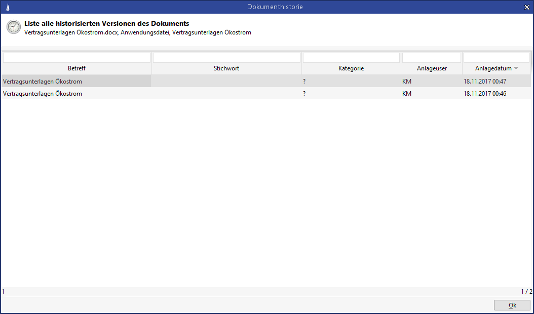 Sie können die historisierten Dokumente über die Spaltenfilter selektieren, z.B. nach dem Anlagedatum, wenn Sie nach einer bestimmten Version eines Dokumentes suchen.