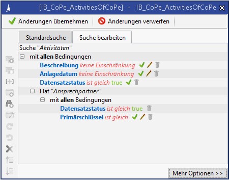 Name der Aktivitätensuche | Hier wird der genaue Name der zuvor definierten Suche hinterlegt. Die Suche muss nach folgendem Schema aufgebaut werden: ![]() Zu beachten ist hierbei, dass die Suche immer von Aktivitäten ausgehen muss und in der Besitzt-Relation die entsprechende Masterentität selektiert (in diesem Beispiel Ansprechpartner). Zudem muss die Suche die Felder "Beschreibung" und "Anlagedatum" der Entität Aktivitäten mit der Funktion "keine Einschränkung" selektieren und die Option "Anzeige in Listen" muss aktiviert werden: ![]() In der Besitzt-Relation (in diesem Beispiel Ansprechpartner) muss der Primärschlüssel mit der Funktion "ist gleich" und der Option "Anzeige in Listen" aufgenommen werden. Darüber hinaus muss jeweils nach dem Feld "Datensatzstatus" mit der Funktion "ist gleich" true selektiert werden. Wird in der Suche eine Besitzt-Relation zu derselben Entität aufgebaut, d. h. Aktivitäten besitzt Aktivitätenverknüpfungen, muss in dem Feld "Primärschlüssel" die Option "Aufnahme in die Selektionsergebnismenge" deaktiviert werden. |