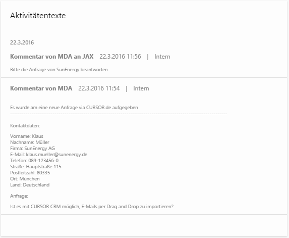 Die Infokachel "Aktivitätentexte" dient zur Anzeige von Aktivitäten aus dem Unterbereich. Sie ist für alle Entitäten verfügbar, welche mit Aktivitäten verknüpft sind.