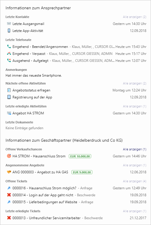 Die Infokachel "Anruferinformationen" zeigt frei konfigurierbare Informationen zu einer anrufenden Person (Ansprechpartner, Geschäftspartner oder Mitarbeiter). Die Informationen sind dabei leicht zu erfassen und sollen per einzelnem Klick in den jeweiligen Detailmasken betrachtet werden können. Auf komplexere Animationen und graphische Elemente wird verzichtet, da die Zeit zur Interaktion im Anrufer-Dialog während eines eingehenden Anrufs beschränkt ist.