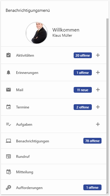 In der Infokachel "Benachrichtigungsmenü" werden Benachrichtigungen in einer Kurzübersicht dargestellt. Dies umfasst im Standard folgende Kanäle: