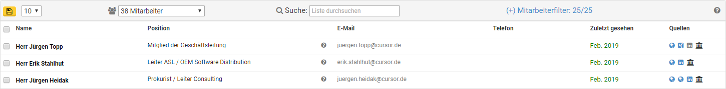 Mitarbeiter | Eingeschaltet Sämtliche aus dem Web und Registern ermittelbare Mitarbeiter (Ansprechpartner) des Geschäftspartners werden mit Telefonnummer, Sozialen Medien, Position/Tätigkeit im Unternehmen und letztem Aktualisierungsdatum angezeigt. ![]() |