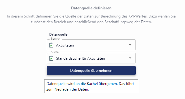 Im Kachelkonfigurationsmenü wird eine neue Datenquelle mitgegeben, wenn das Feld zum Hinterlegen der Datenquelle neu befüllt wird.