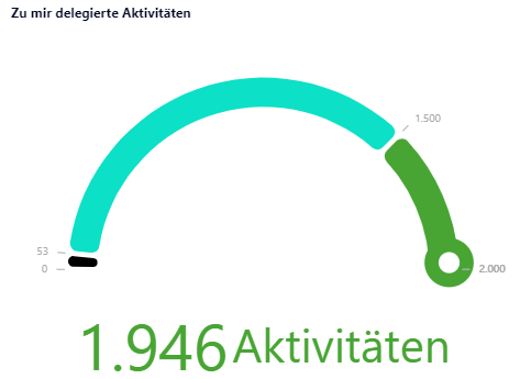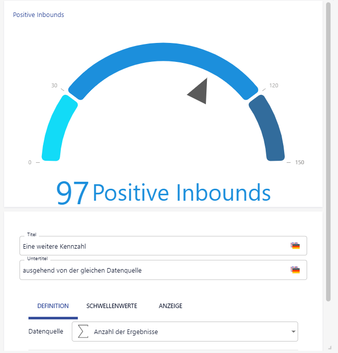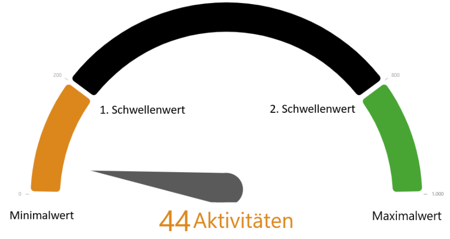 Die Tacho-Anzeige zeigt die Kennzahl als Text dar und stellt die Zahl im Kontext der vorgegeben Schwellenwerte dar: