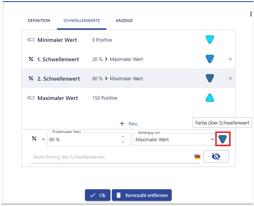 Für die Farbgebung der KPI kann auf den "Pfeil" zugehörig zu dem Wert geklickt werden:
