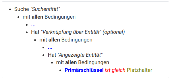 Pk des aktuellen Datensatzes übergeben | Eingeschaltet Der Pk des aktuellen Datensatzes (auf Entitätsboards) wird als erster Platzhalter an die Suche mit übergeben. Die Suche muss entsprechend konfiguriert sein (d.h. genau einen Platzhalterzweig besitzen, der den Pk zur Anzeige-Entität aufnimmt). Beispielstruktur der Suche: ![]() Ausgeschaltet Der Pk des aktuellen Datensatzes wird ignoriert und nicht an die Suche übergeben (standard). |