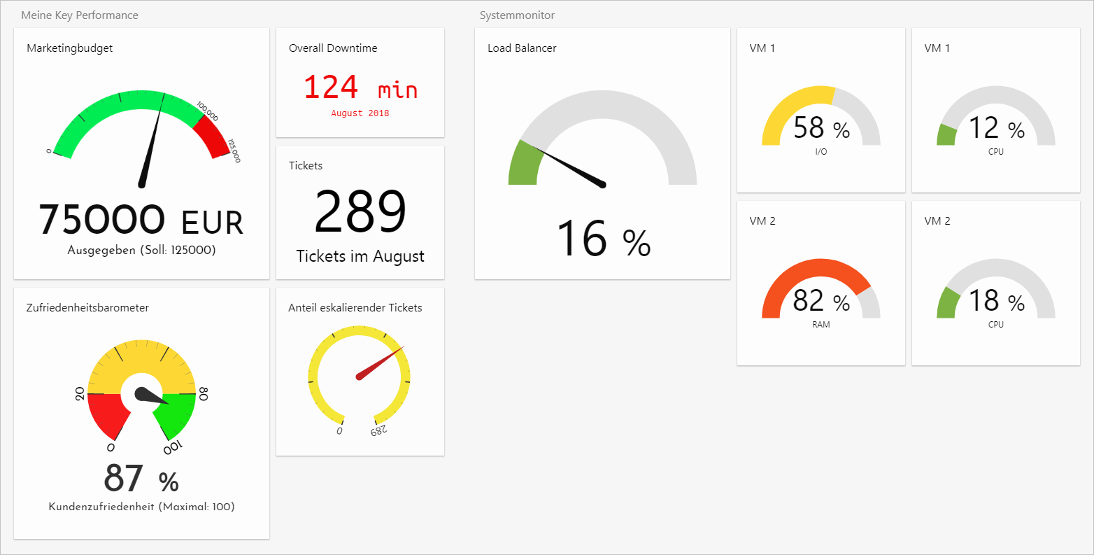 Schwellenwerte immer anzeigen | Eingeschaltet Die farblichen Bereiche, die durch die Schwellenwerte begrenzt werden, sind immer sichtbar. Ausgeschaltet Der Bereich zwischen 0 und dem Wert des KPI wird in der Standardfarbe oder der Farbe des unter-/überschrittenen Schwellenwertes angezeigt, der Rest ist grau. |