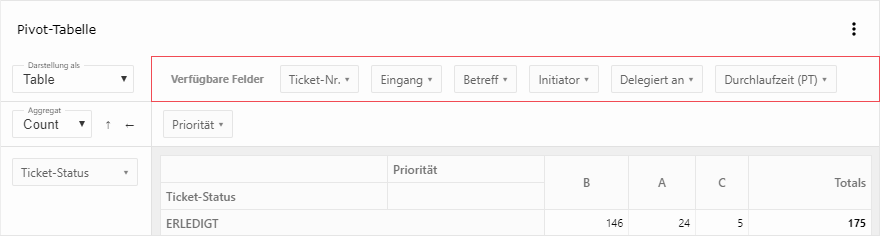 Die Kachel stellt Ihre Daten in einem flexiblen Tabellenlayout dar, wobei auch alternativ verschiedene Heatmap- und Chart-Darstellungen möglich sind. Dabei können Sie beliebige Datenquellen aus Ihrem CRM auswählen - im Schnellzugriff auf Ihren BI-Boards oder flexibel aus unterschiedlichsten Datenbereichen per Suchen. Wählen Sie auf der Kachel einfach per Drag'n'Drop die die Felder bzw. Attribute aus, die sie analysieren und vergleichen möchten, und verteilen Sie diese auf Zeilen und Spalten, um sie zu gruppieren oder gegenüberzustellen.