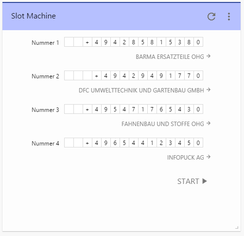 Die Infokachel "Slot Machine" zeigt zufällig zusammengestellte Telefonnummern von Geschäftspartnern an. Der Zufallsgenerator wird über den Start-Button aktiviert.