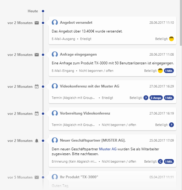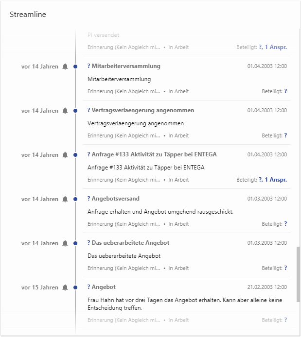 Die Infokachel "Streamline" zeigt beliebige datumsbezogene Datensätze in absteigender Reihenfolge (als Stream bzw. Timeline) an. Der Beginn ist immer das heutige Datum. Einträge nach diesem Datum können nicht angezeigt werden. Der Standardanwendungsfall ist die Anzeige von Aktivitäten.