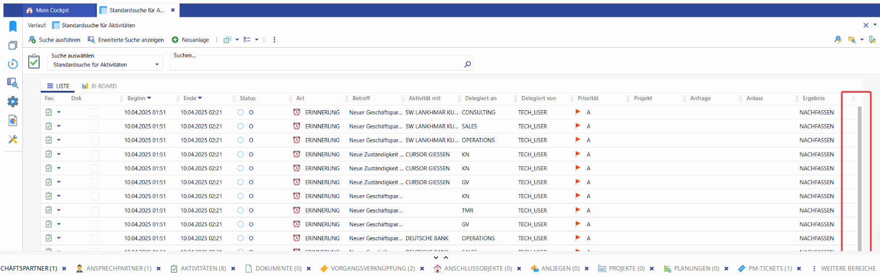 1. Mit STRG+↑ verschieben Sie den Fokus aus einem Feld der Liste (blau markiertes Feld) in den Spaltenfilter.