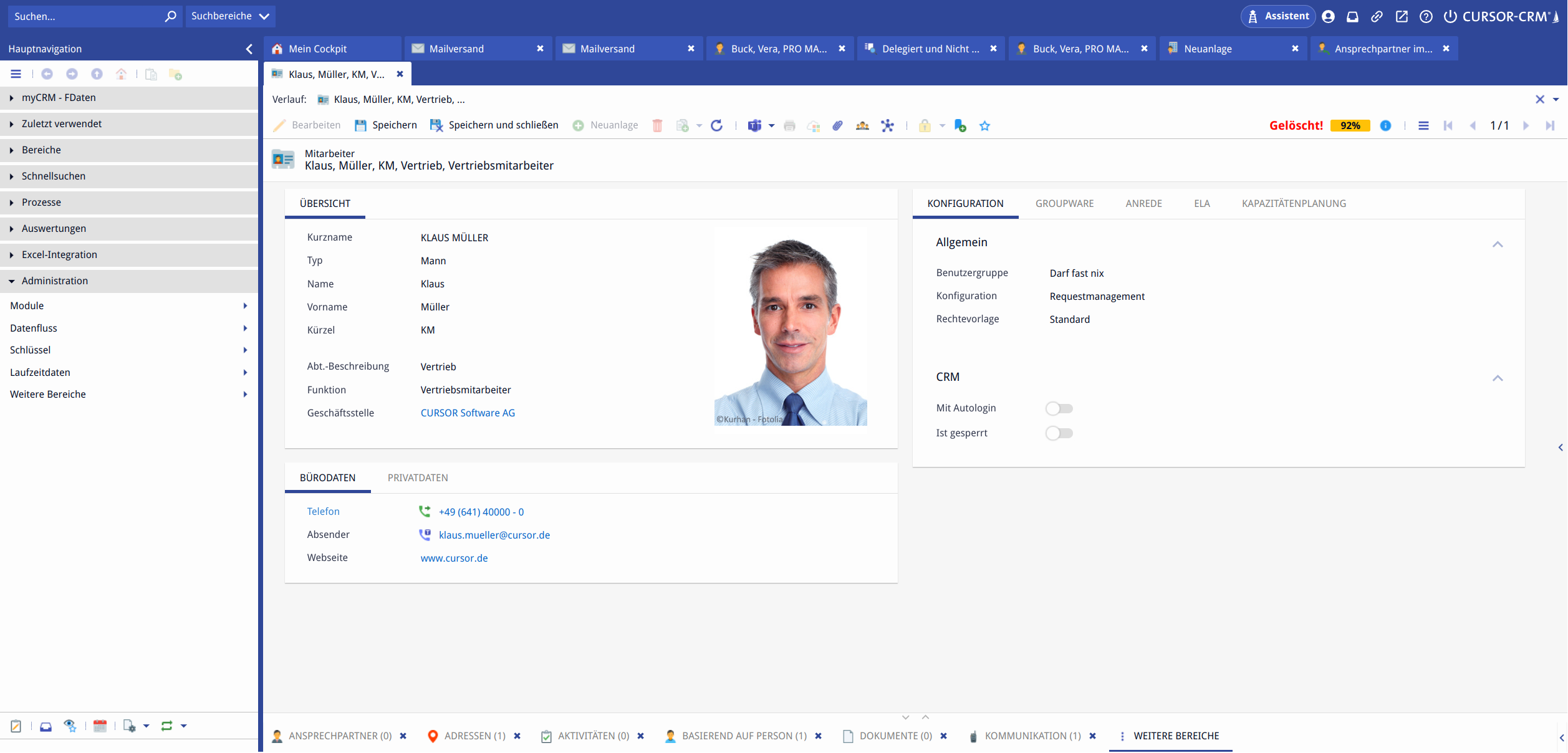 Mitarbeiter des Systembetreibers sind zugleich Benutzer im CRM-Sysem. Jeder Mitarbeiter / Benutzer verfügt über entsprechende Berechtigungen. Die Mitarbeiterdatensätze können bearbeitet werden.