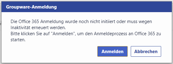 Ist der Anwender über MS Graph bzw. Office 365 nicht authentifiziert, bekommt er eine Hinweismeldung im CRM-System beim Durchführen einer Aktion, welche die Benutzerauthentifizierung erfordert (z.B. Versand einer E-Mail). Mit einem Klick auf Anmelden wird der Authentifizierungsprozess gestartet.