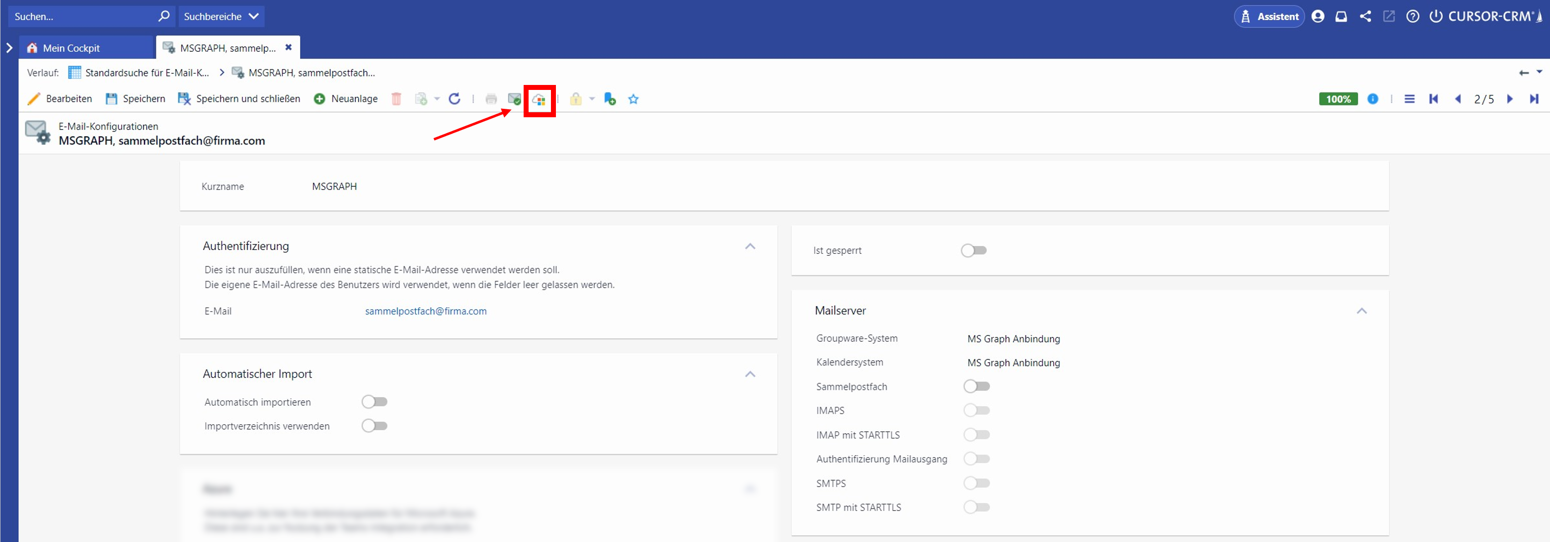 Für E-Mail-Konfigurationen, die bei keinem Mitarbeiter hinterlegt sind (weil es sich zum Beispiel um ein Sammelpostfach handelt), kann die Authentifizierung auch direkt auf der E-Mail-Konfiguration durch einen berechtigten Administrator durchgeführt werden.