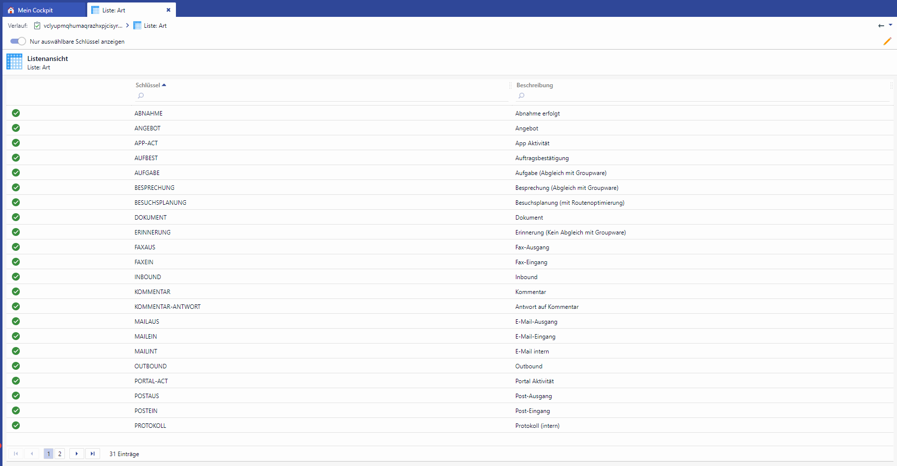 Mit einem Klick auf Zurücksetzen in der Schlüsseltabelle können Sie ein Nachschlagefeld leeren und zur Suchmaske zurück navigieren. Bedingung: das Nachschlagefeld darf kein Pflichtfeld sein. Die Spalte Schlüssel können Sie mit einem Mausklick auf