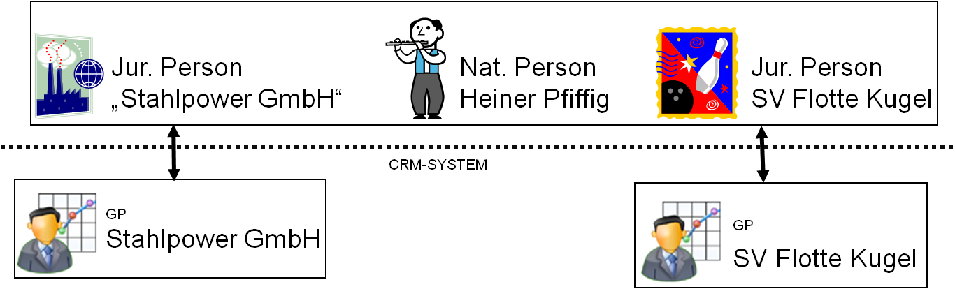 Die Besonderheit bei der Rolle Ansprechpartner ist, dass diese mit zwei Personen verknüpft ist. Wie jede andere Rolle gehört sie zu einer basierenden Person. Zudem ist sie mit dem Geschäftspartner bzw. dessen Person (Firma, Verein usw.) verknüpft, welchen sie als Ansprechpartner repräsentiert.