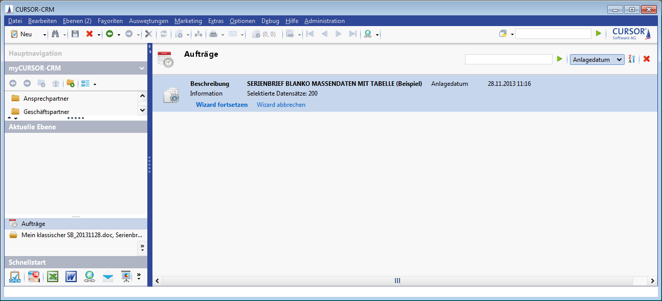 Wenn die Module eingespielt sind, ist der Menüpunkt unter Marketing / Serienbrief (Massendaten) sichtbar. Ein Vorlagensatz wird von der CURSOR Software AG ebenfalls zur Verfügung gestellt.