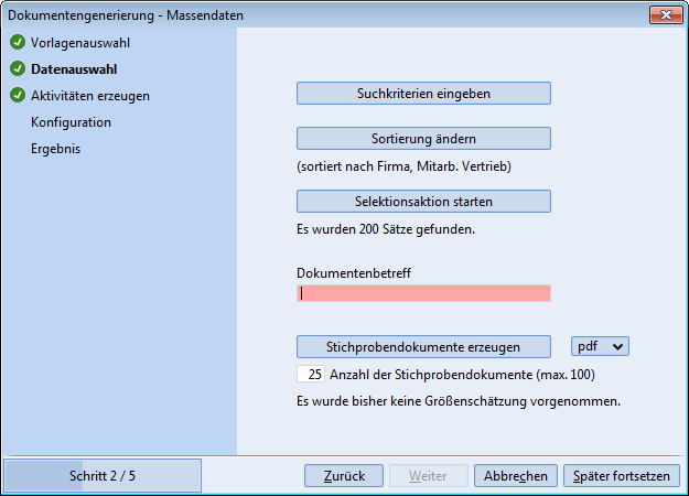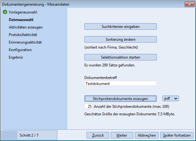 Wenn Sie sich die zu erstellenden Serienbriefe stichprobenweise anschauen möchten, können Sie eine Stichprobe von maximal 100 Dokumenten erzeugen. Die Stichprobe wird über die gesamten gefundenen Datensätze gleich verteilt. Bei 200 Datensätzen und 25 Stichprobendokumenten wird jedes achte Dokument generiert. Bei 1000 Datensätzen und 100 Stichprobendokumenten wird jedes zehnte generiert usw. Somit wird sichergestellt, dass nicht nur die Anfangsdokumente korrekt generiert werden.