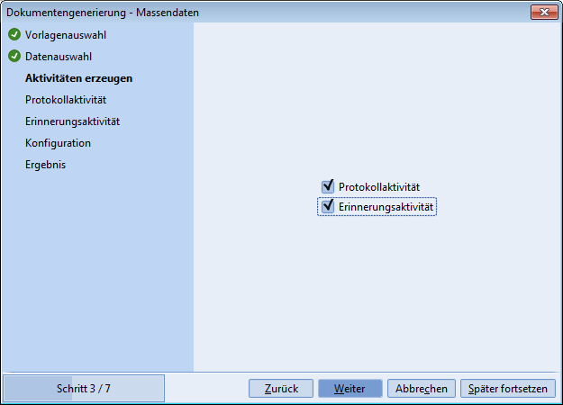 Dieser Schritt ähnelt der klassischen Serienbrieferstellung. Im Unterschied dazu gibt es jedoch keine Möglichkeit, die Sammelaktivität anzulegen. Es werden ausschließlich Einzelaktivitäten generiert. Die Aktivitätenerzeugung ist optional und kann nur einmalig ausgeführt werden.