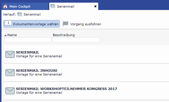 Klicken Sie in der Navigation auf Serienmail (Massendaten), um die Serienmailerstellung zu starten. Der Dialog zur Vorlagenauswahl wird geöffnet. Während der kompletten Serienmailaktion werden Sie mit Hilfe des Assistenten und der Taskleiste geführt.