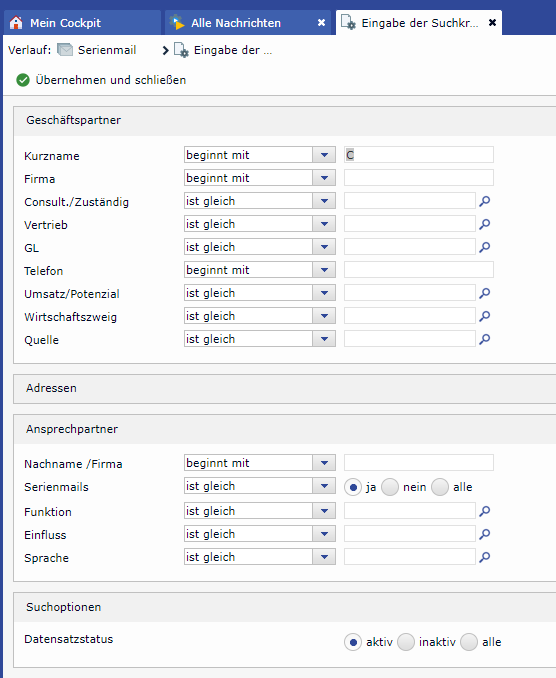 Der Anwender kann entscheiden zwischen Sammelaktivität und EinzelaktivitätenDer Vorlage ist in der Adminkonsole eine Suche zugeordnet, die die Adressaten findet. Im Assistenten kann diese Menge gefiltert werden
