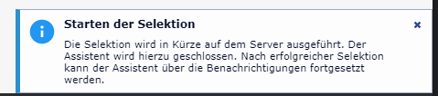 Es erscheint vor dem Schließen des Assistenten eine Hinweismeldung, dass die Verarbeitung auf dem Server fortgeführt wird. Das Ergebnis wird wieder in der Taskliste - analog zur Suchausführung - angezeigt.