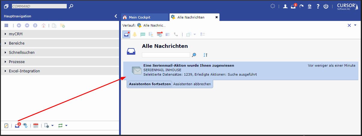 Wird die Aufgabe auf dem Server beendet, wird der Anwender darüber über das Benachrichtigungssystem informiert. Es erscheint ein Eintrag auf dem Nachrichten-Desktop. Von hier aus kann der Anwender mit einem Klick auf Assistenten fortsetzen zu dem weiteren Assistenten-Schritt wechseln.