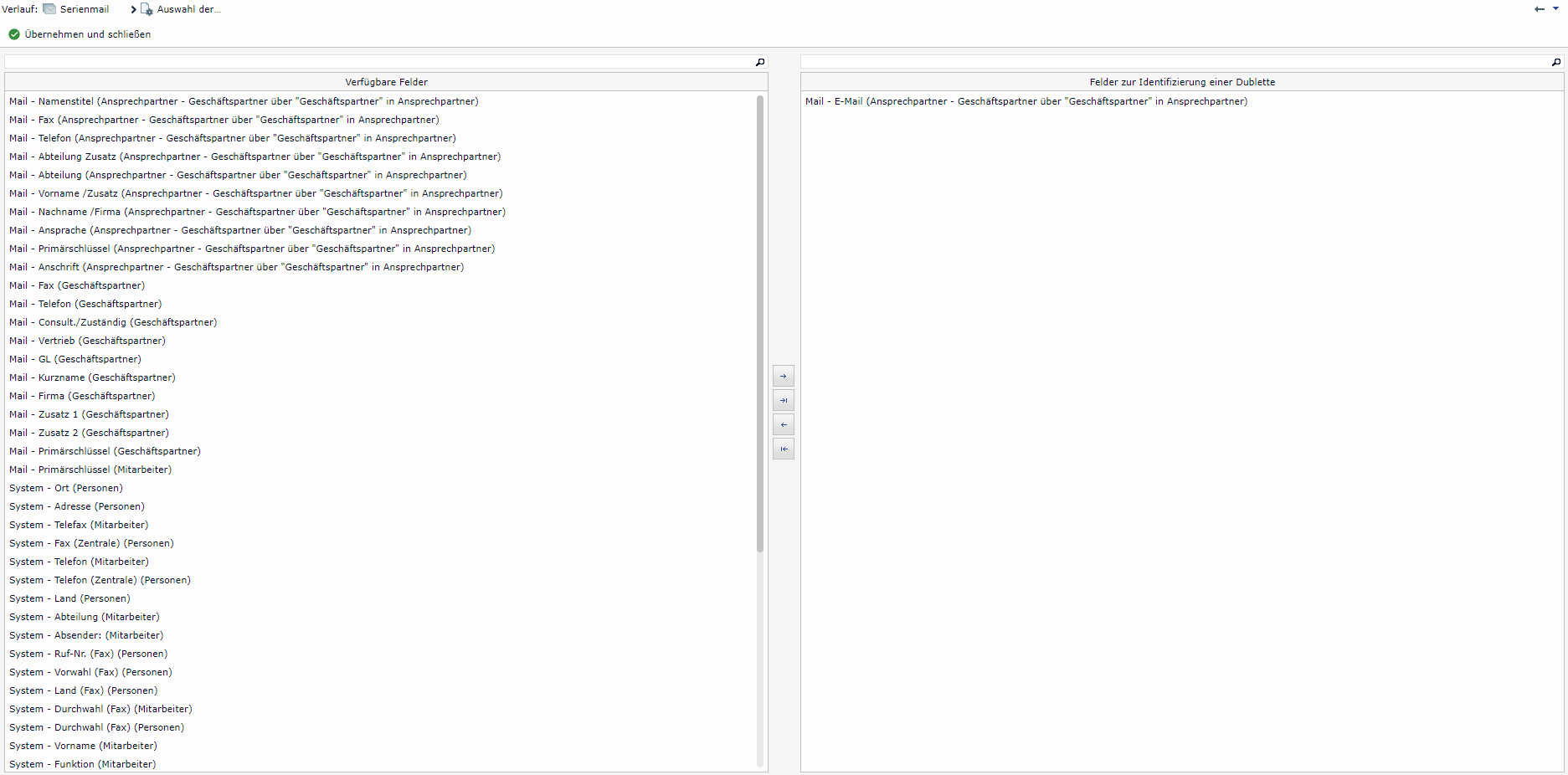 Um Dubletten bei der Versand Ihrer Mails zu verhindern, können Sie anschließend die Dublettenprüfung durchführen. Hierzu können Sie beliebige Felder als Vergleichskriterium heranziehen.