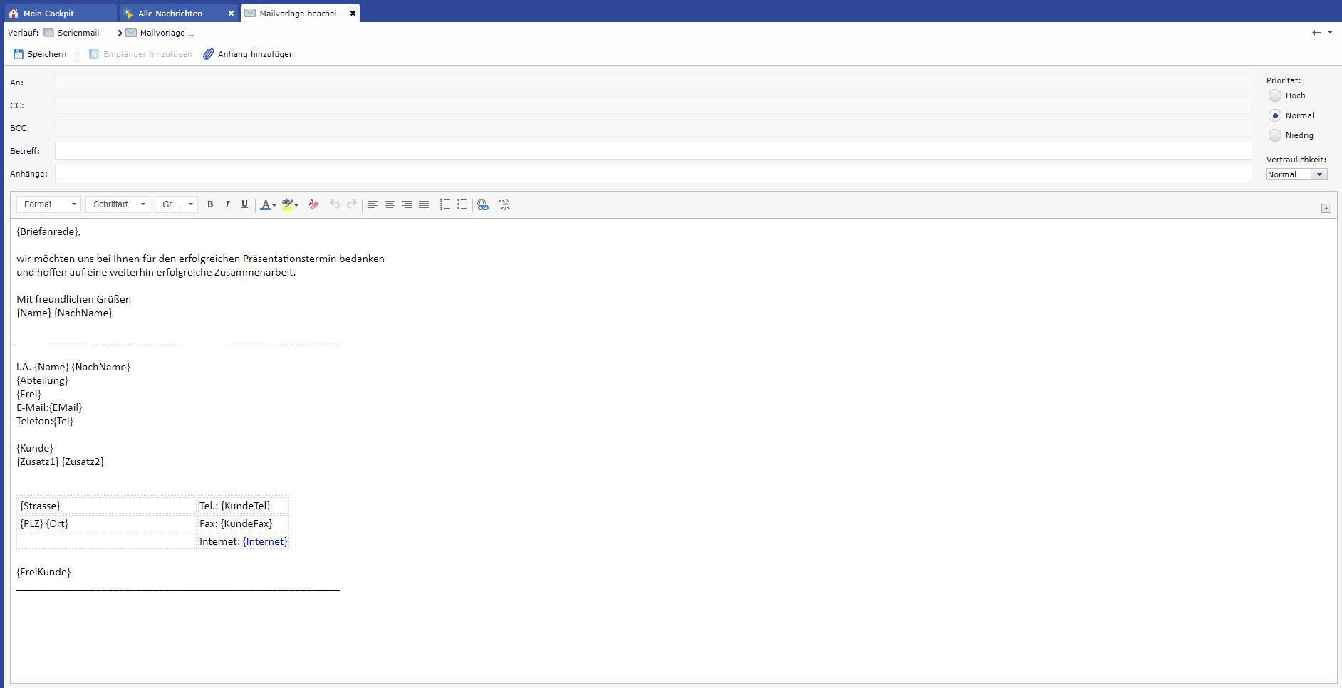 In diesem Dialog können Sie den Mail-Text und die Text-Variablen einfügen. Zusätzlich können Sie Anhänge (CRM-Dateien und externe Datein) hinzufügenSerienmailvorschau