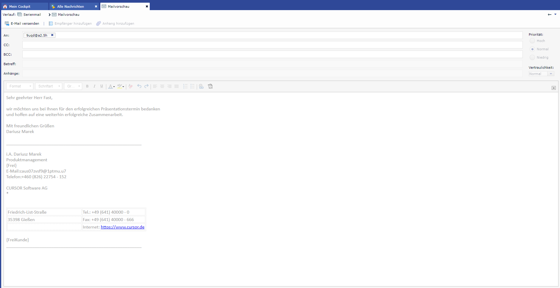In diesem Dialog sehen Sie die Mail mit gefüllten Text-Variablen und Anhängen. So sieht die künftige Mail aus.