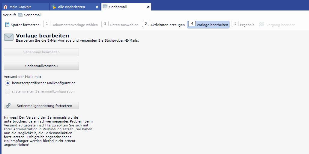 Falls ein schwerwiegendes Problem bei der Serienmailgenerierung aufgetreten ist (ein komplettes Paket an Mail konnte nicht versandt werden) wird die Serienmailaktion unterbrochen und die Kontrolle zurück an den Client übergeben. In diesem Fall landet der Anwender wieder in der Assistentenseite Vorlage bearbeiten.