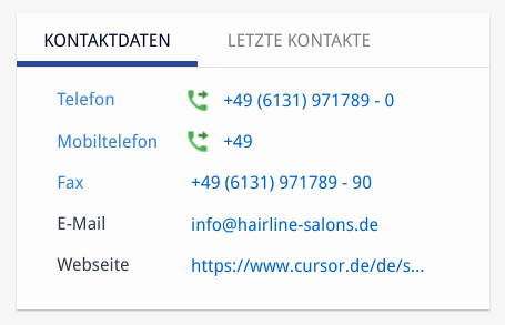 Der CTI-Outbound kann mit einem Klick auf ein Icon ausgelöst werden. Der Icon-Status wechselt von grün nach rot. Neben allen relevanten Telefon-Feldern oder Feldern mit Telefon-Information wird auch in den Masken ein Anruf-Button platziert.