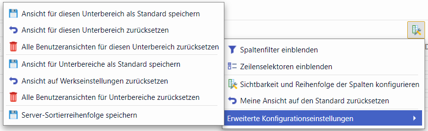 Ansicht für diesen Unterbereich als Standard speichern ADMIN-RECHTE | Die aktuelle Ansicht wird für diesen Unterbereich als Standard gespeichert. Andere Anwender, die diesen Bereich öffnen, sehen die definierte Ansicht (sofern keine Benutzerkonfiguration existiert). |
