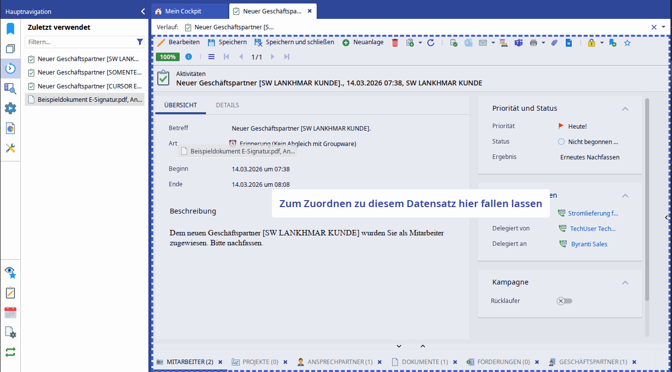 Einträge aus der Hauptnavigation aus der Rubrik “Zuletzt verwendet“ und “Lesezeichen“ können per Drag and Drop mit einem bereits in der Detailansicht geöffneten Datensatz verknüpft werden.