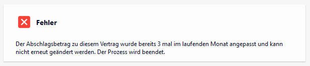 Eine Abschlagsänderung zu einem Abrechnungsvertrag darf eine konfigurierbare Anzahl an Prozessdurchläufen je Monat nicht überschreiten. Hierdurch soll verhindert werden, dass ein Endkunde seinen Abschlag bspw. täglich erneut um 10% reduziert.