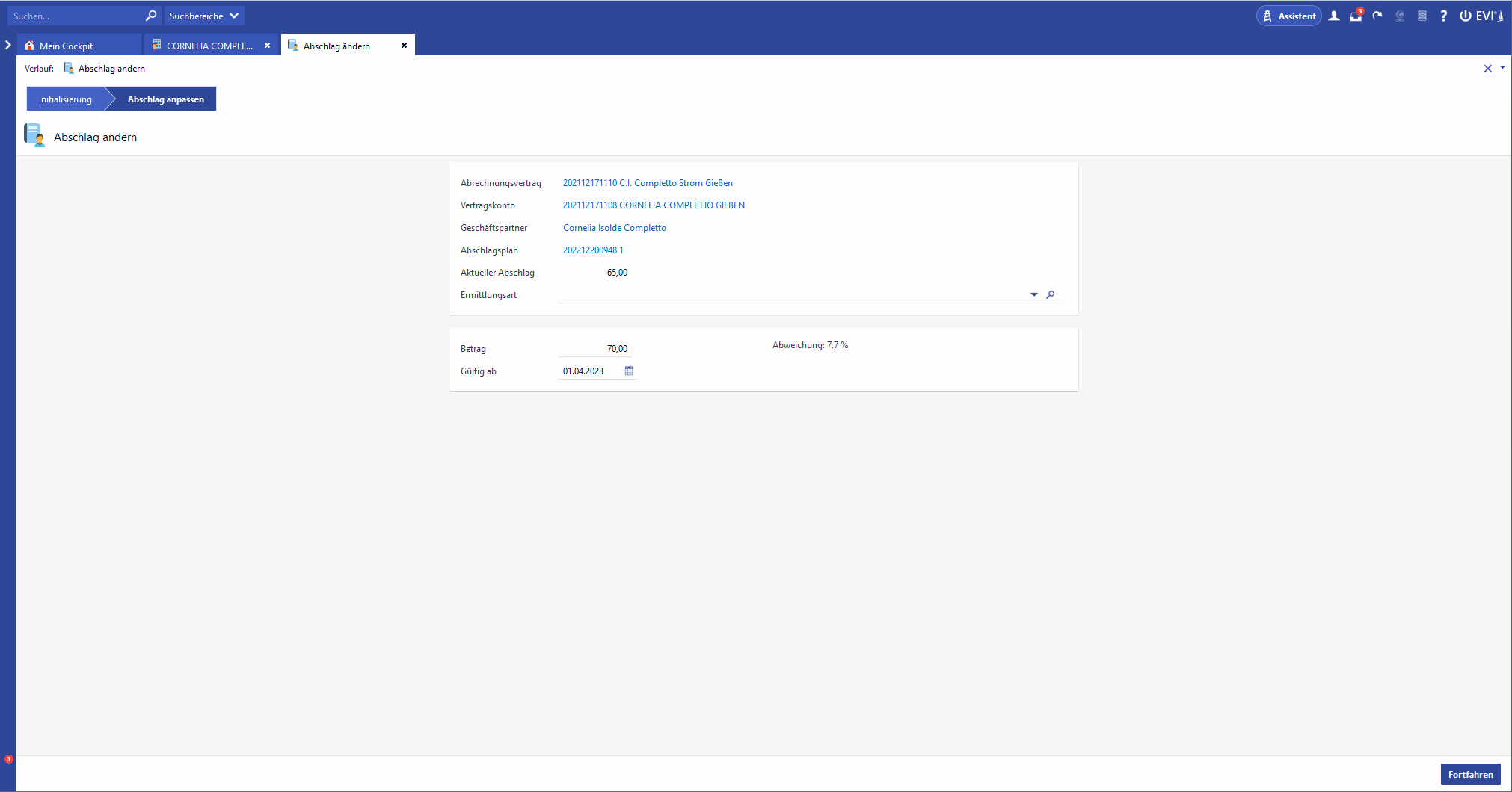 Abweichung | Zeigt die prozentuale Abweichung zwischen dem alten und dem neuen Abschlagsbetrag an |